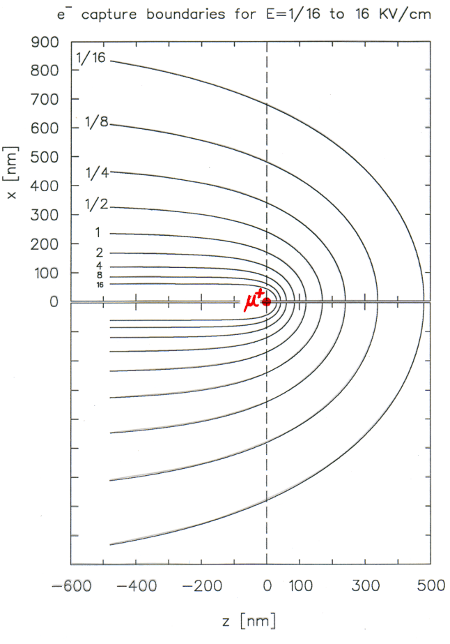 The volume of the capture region to the right of the muon (bounded by the z = 0 plane) is proportional to E-3/2.