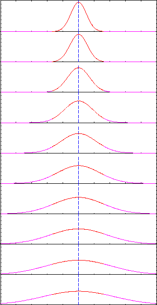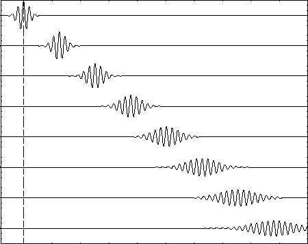 This raises the question: What do the "wiggles" represent? When the particle is (on average) at rest, its wave packet is just a "bump" that spreads out with time; when it is moving, it acquires all these oscillations of phase with a wavelength satisfying de Broglie's formula. Is it really "there" at the peaks and "not there" at the points where the function crosses the axis? No. Except for the overall "envelope" it is just as "there" at one point as at another. This is a direct consequence of using the complex exponential form (rather than a cosine) for the travelling wave. Although the plots above show only the real part, there is an imaginary part that is a maximum when the real part is zero and vice versa so that the absolute magnitude is always (except for the overall "envelope") the same.