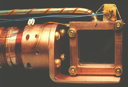 Closeup of sample cell at tip of coldfinger cryostat used for µSR studies of condensed gases, showing thermometry and heater at top of cell and attachment to coldfinger at bottom. This arrangement provides a temperature gradient for growing void-free crystalline samples. [G.D. Morris, 1997]