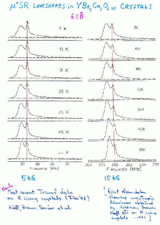 Lineshapes vs. Temperature in YBCO(6.95) at 5 and 15 kG